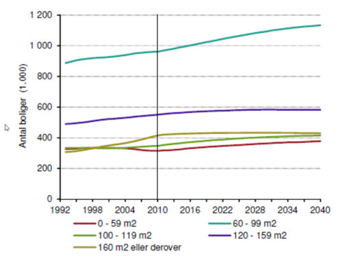 Forandringerne består i, at den samlede boligefterspørgsel vokser, og i at den vil rette sig mod de største bycentre, det vil sige især landsdel Københavns by og Århus. Den voksende boligefterspørgsel skyldes, at vi bliver flere danskere, og at vi samtidig får et fald i den gennemsnitlige husstandsstørrelse. Folketallet vil stige fra 5.6 millioner til 6 millioner frem til 2040. Det skyldes, at vi vil have et fødselsoverskud, om end aftagende over tiden, og at vi må påregne en fortsat positiv nettoindvandring. I alle landsdele vil andelen af singlehusstande vokse. I Københavns by vil singlehusstandene i 2040 udgøre 67% af alle husstande. Børnefamilierne, som politikerne ofte ønsker til byen, vil kun udgøre 15%. København vil være den landsdel, der har den højeste andel af singler, og samtidig den relativt yngste befolkning.